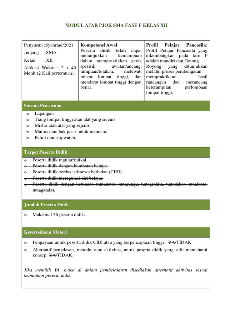 Dalam pembelajaran lompat tinggi di kelas 10, biasanya materi akan mencakup: